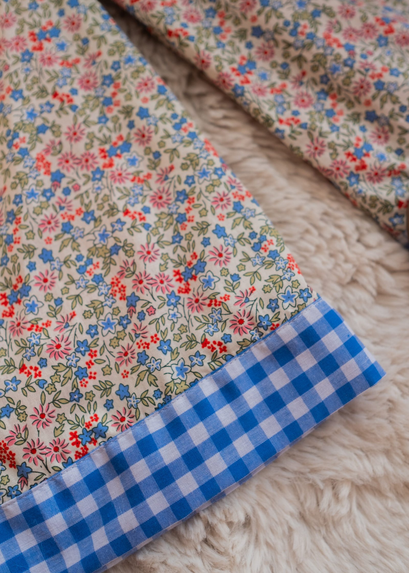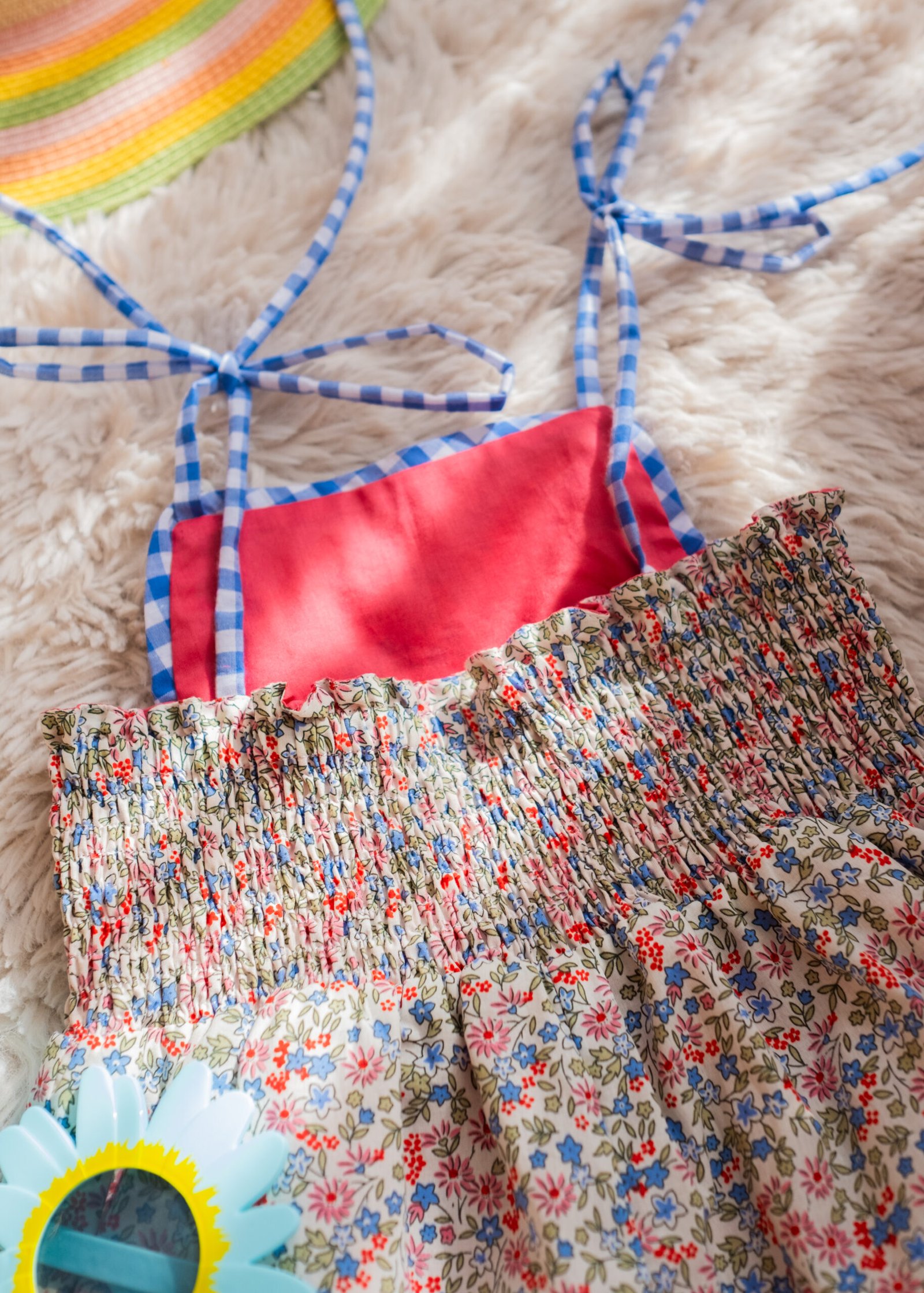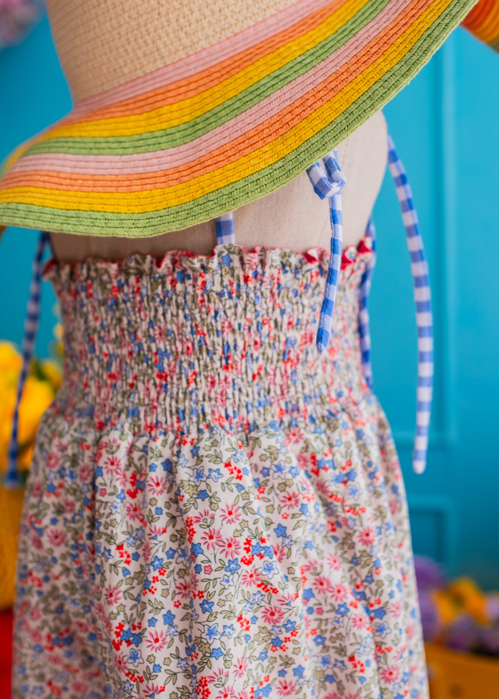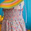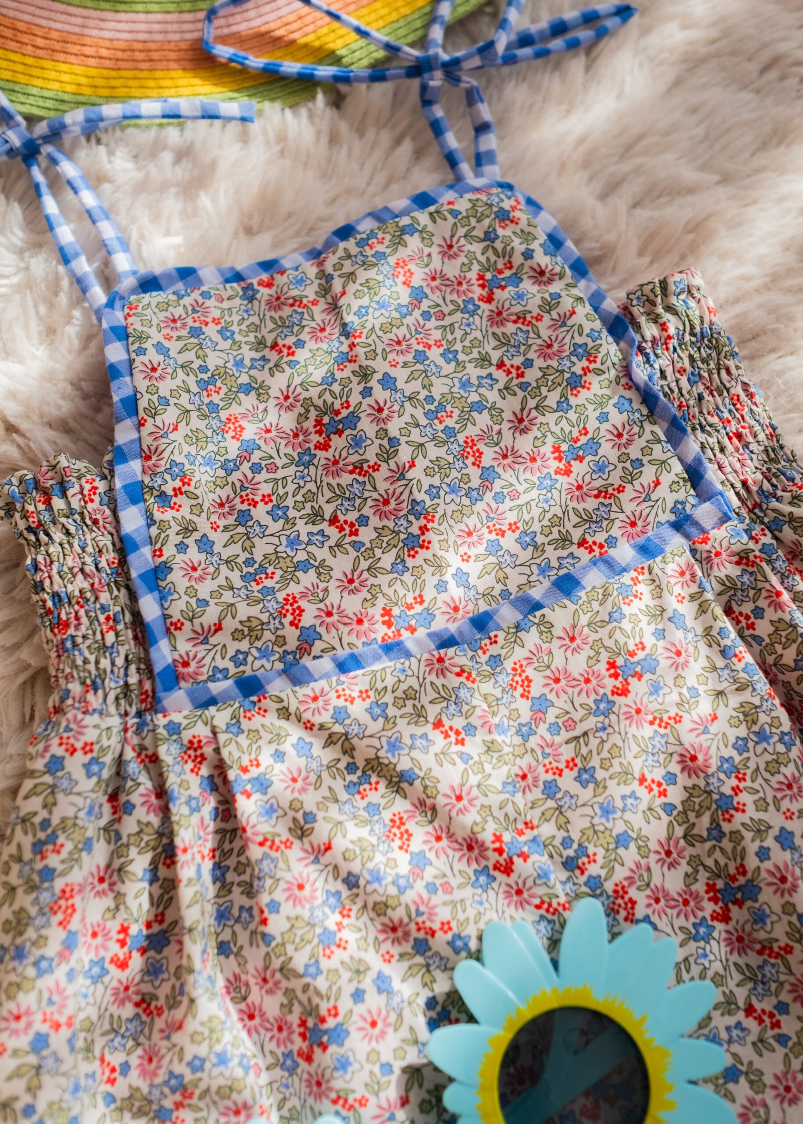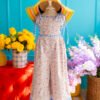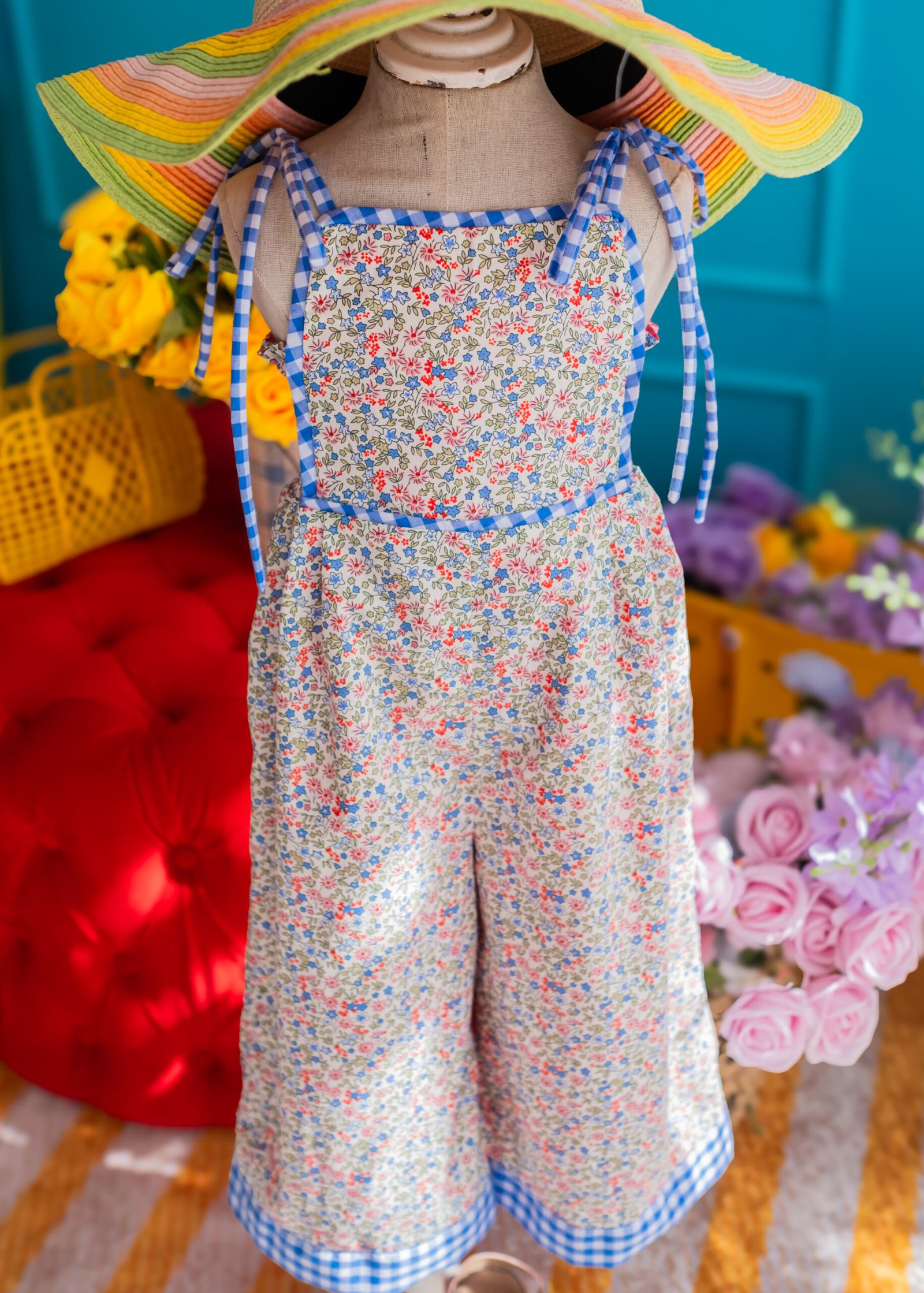 • A sweet floral romper in soft pastel tones, accented with delicate blue gingham trims and dainty tie straps for an adjustable fit. Light and airy with a relaxed silhouette, it’s perfect for sunny days, playtime, and picture-perfect moments.