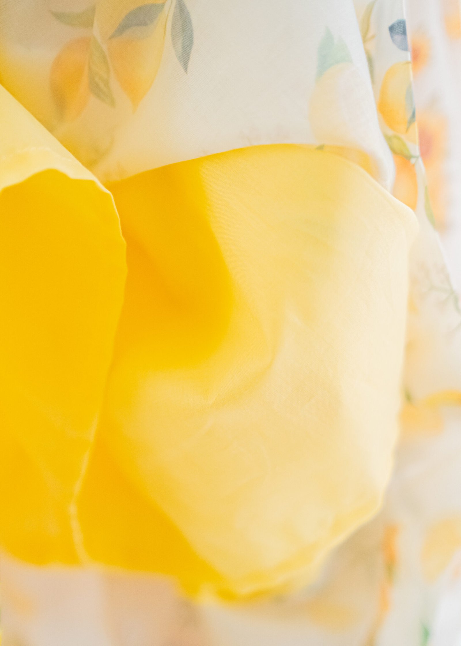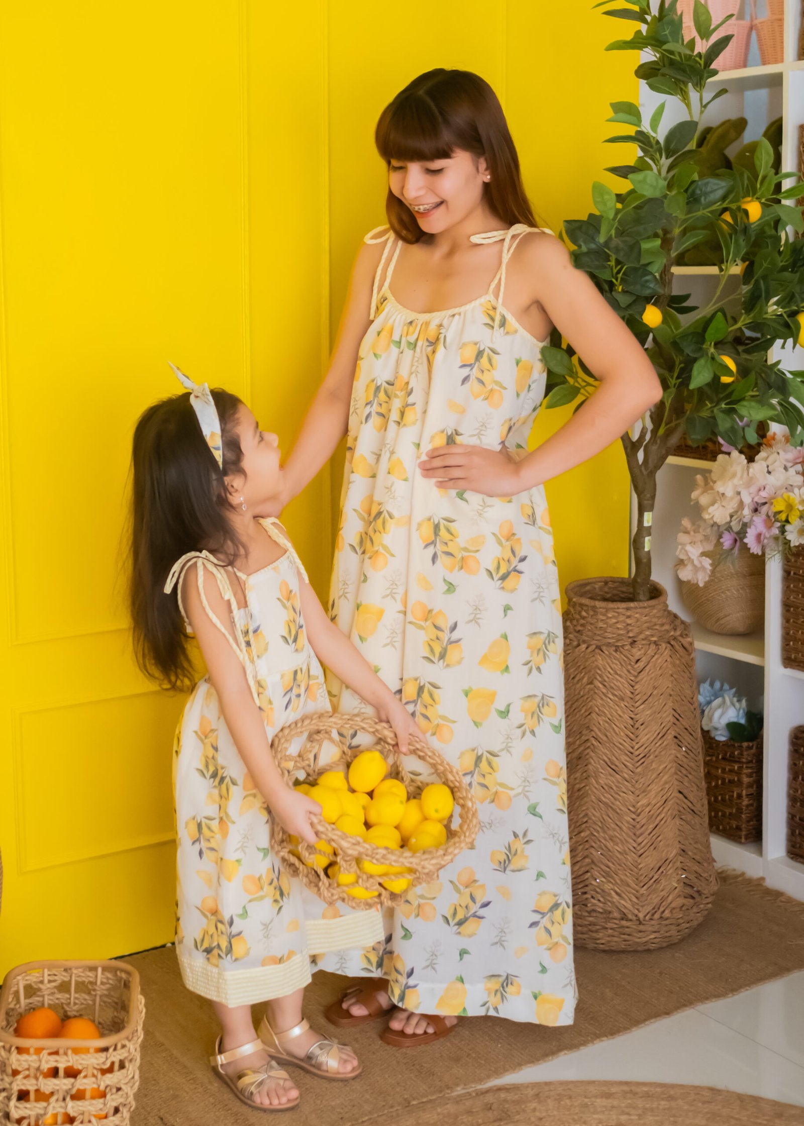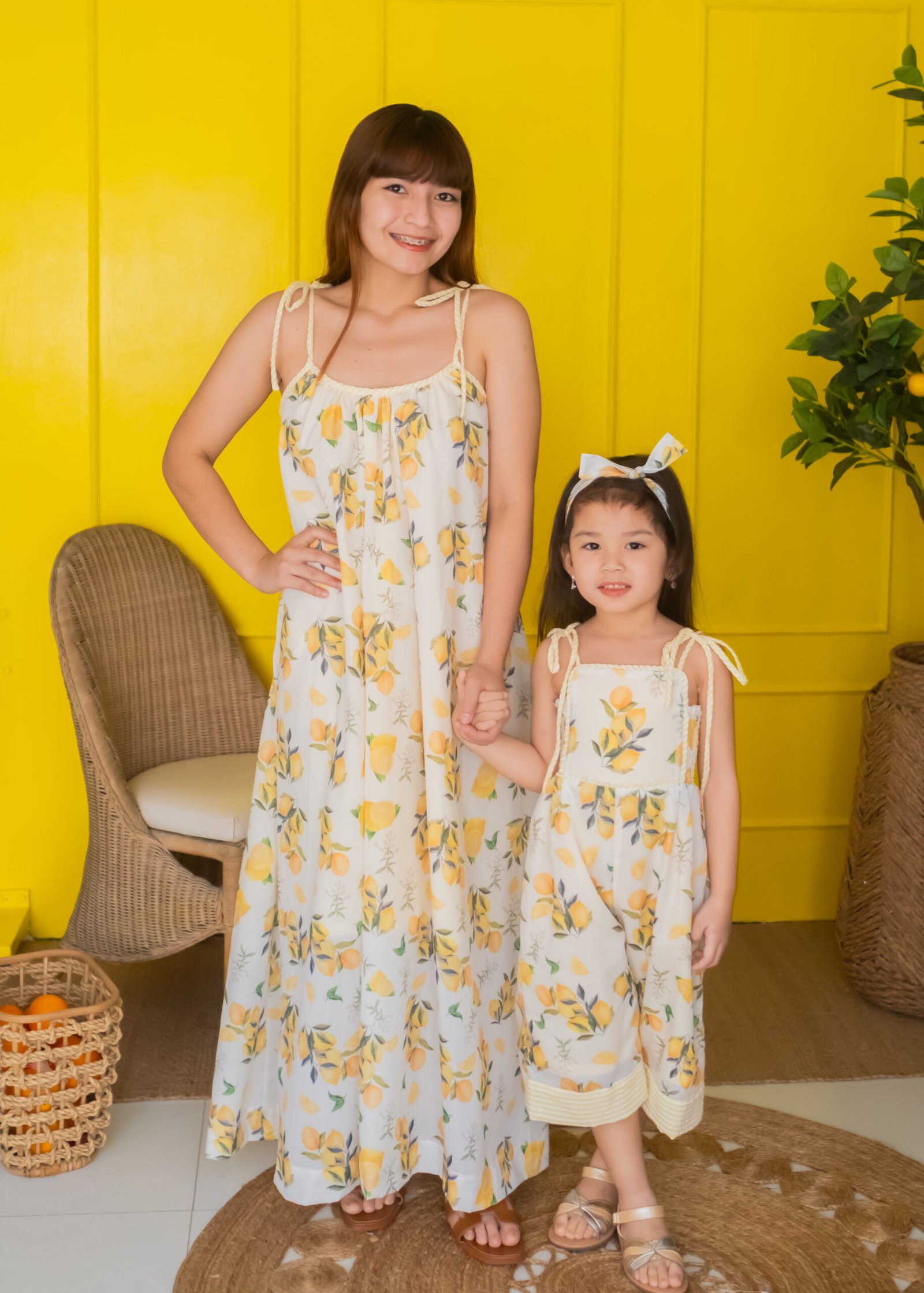 This outfit is crafted from lightweight polyester and cotton fabric.It feature a playful lemon print on a soft cream background.