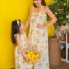 An oversized, flowy maxi dress with spaghetti straps and a relaxed fit, offering a breezy and comfortable feel. The child’s outfit is a sleeveless jumpsuit with adjustable spaghetti straps and a ruched bodice, providing a cute and comfy style. Both pieces are non-stretch, making them perfect for warm-weather occasions with a fresh, summery vibe.