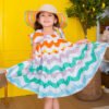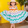 This dress features an adorable toddler girl’s summer outfit, consisting of a colorful, ruffled dress with rainbow wave patterns and matching bloomers. The dress has large, playful bows on the shoulders, adding a charming and whimsical touch.