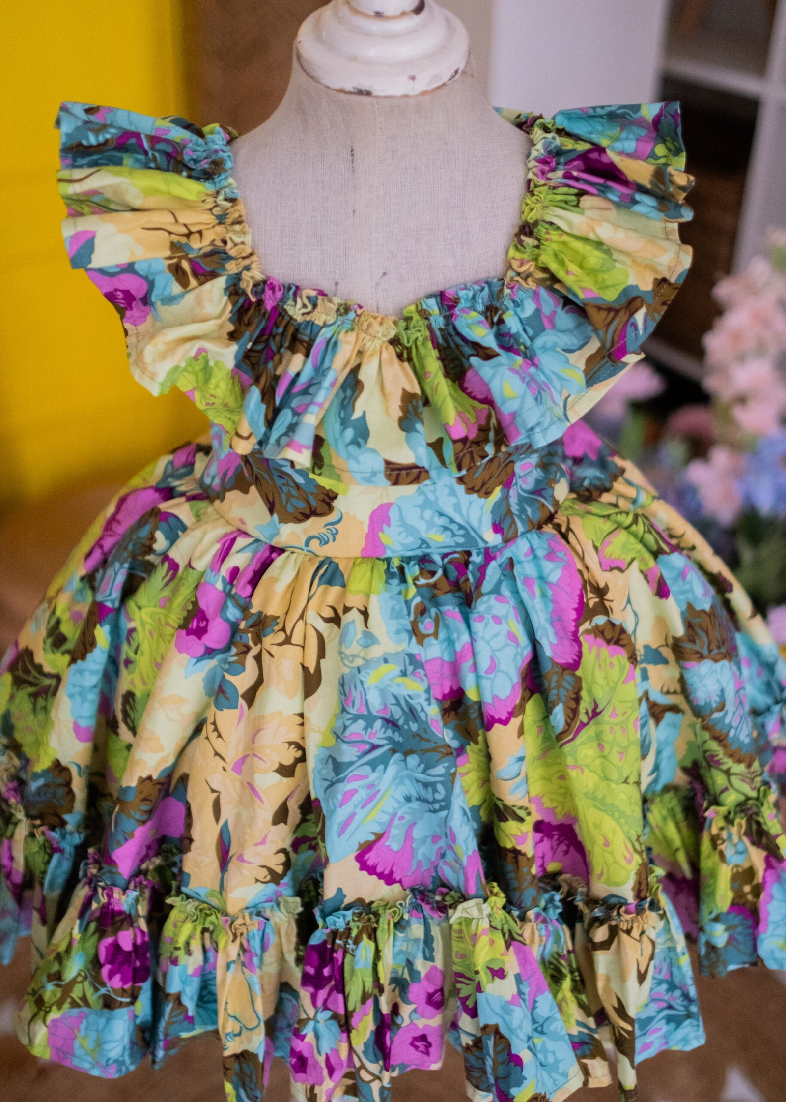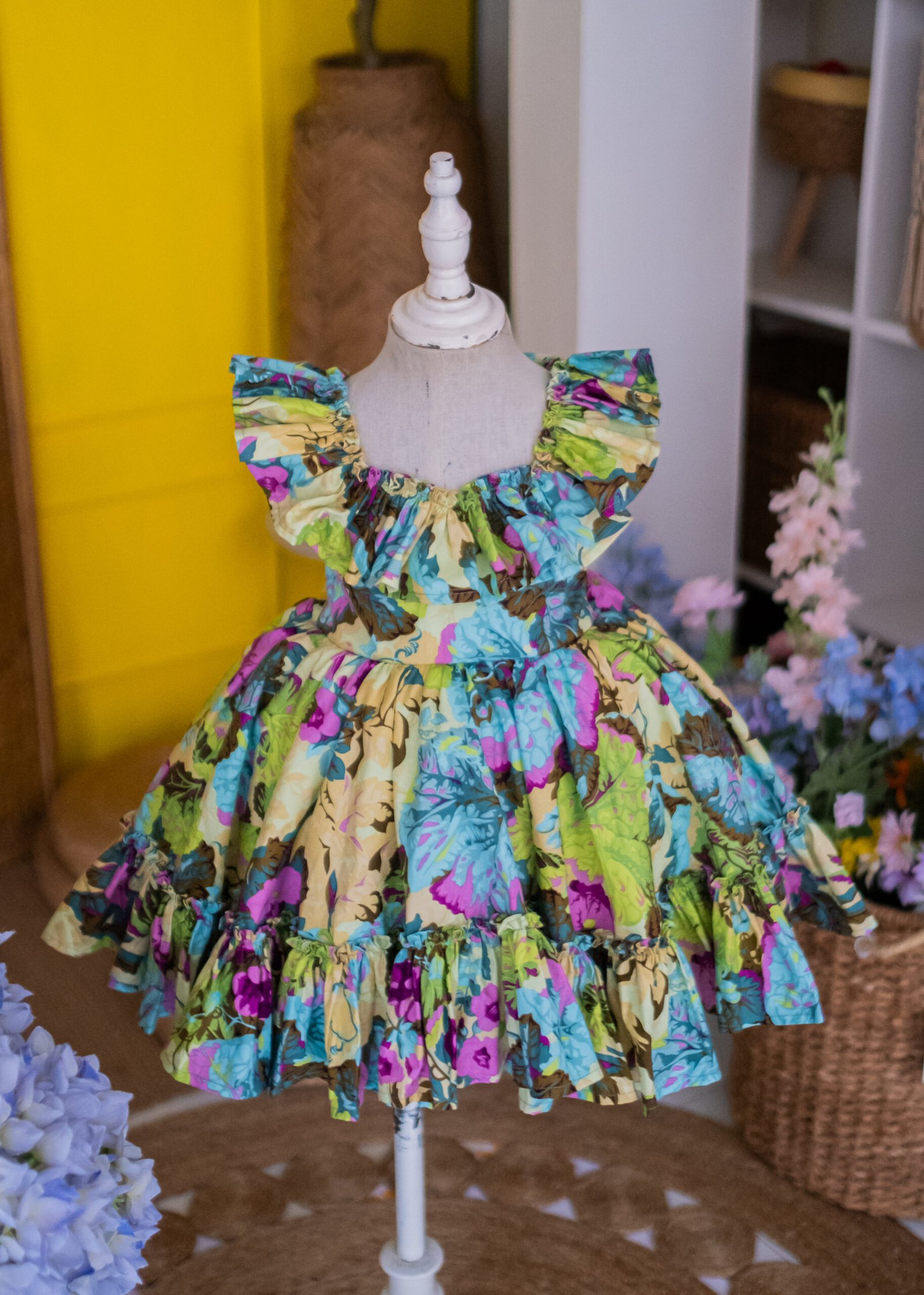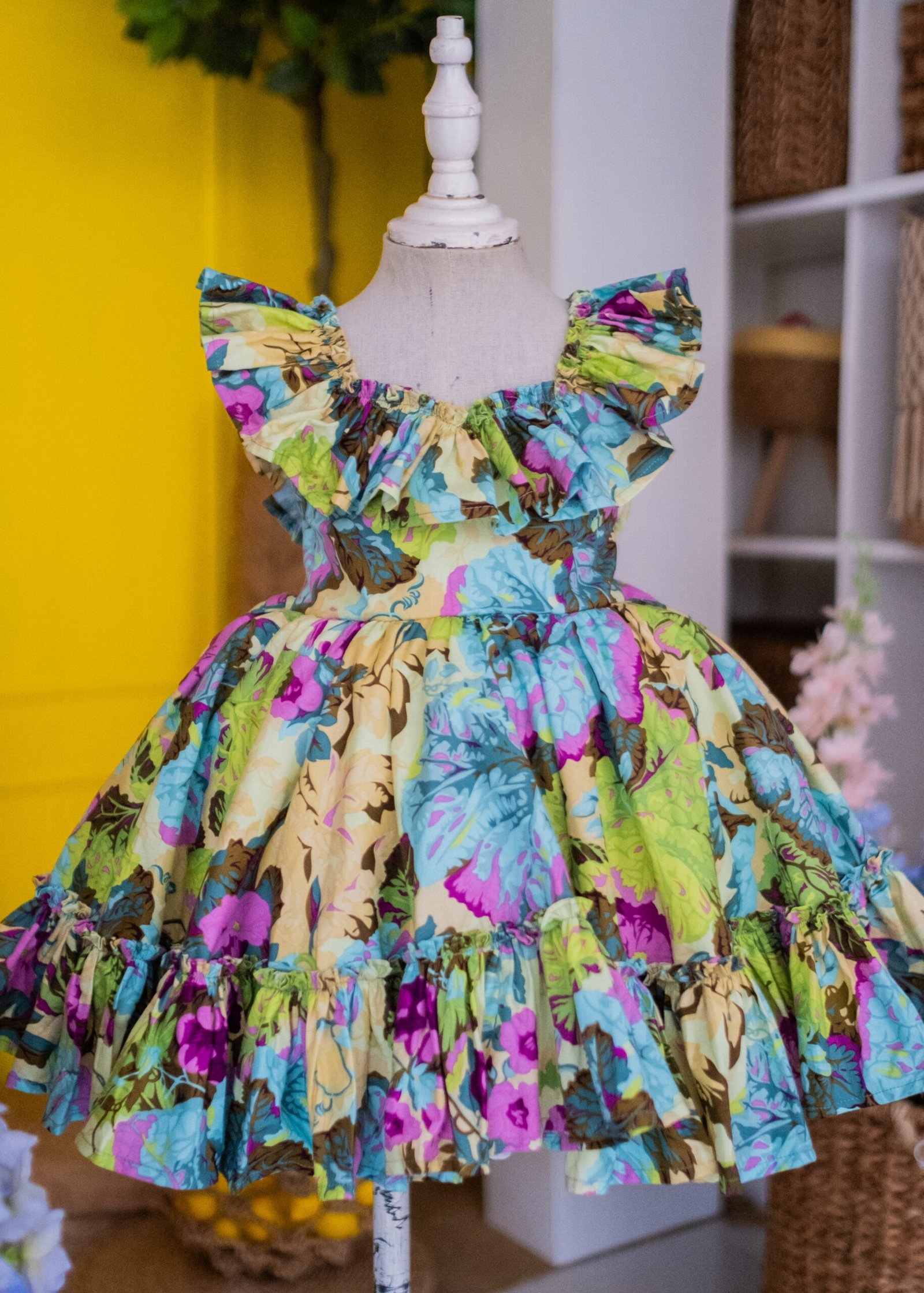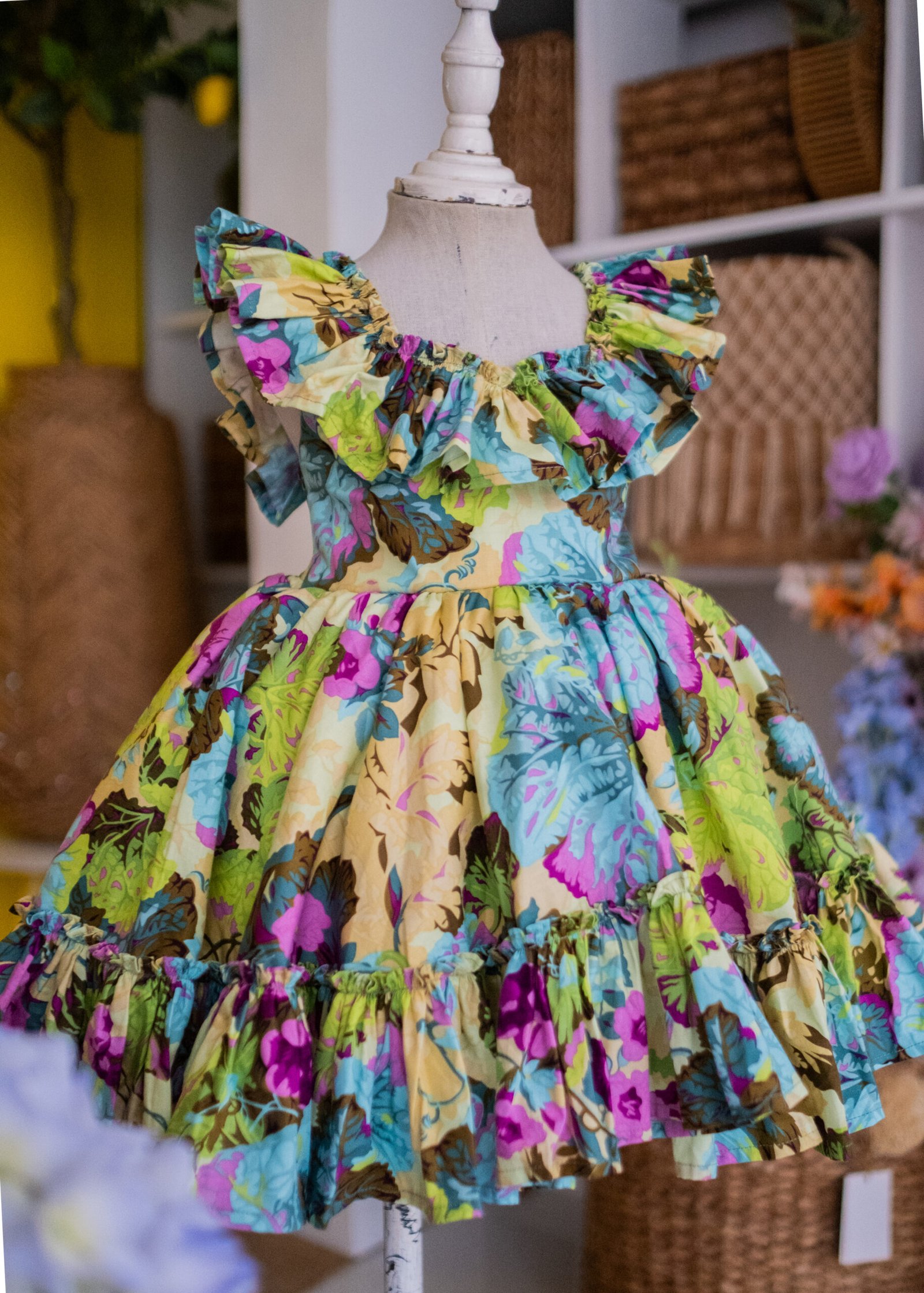 This charming kids’ dress features a vintage-inspired design with ruffled sleeves, a fitted bodice, and a twirly, full skirt trimmed with a playful ruffle. The fabric is decorated with bold, colorful prints of caladium-like tropical leaves in shades of teal, magenta, lime green, and brown on a soft beige background. The bright, leafy pattern adds a fun and cheerful touch, perfect for sunny days and special outings. It’s a delightful blend of whimsy and elegance for little ones.