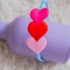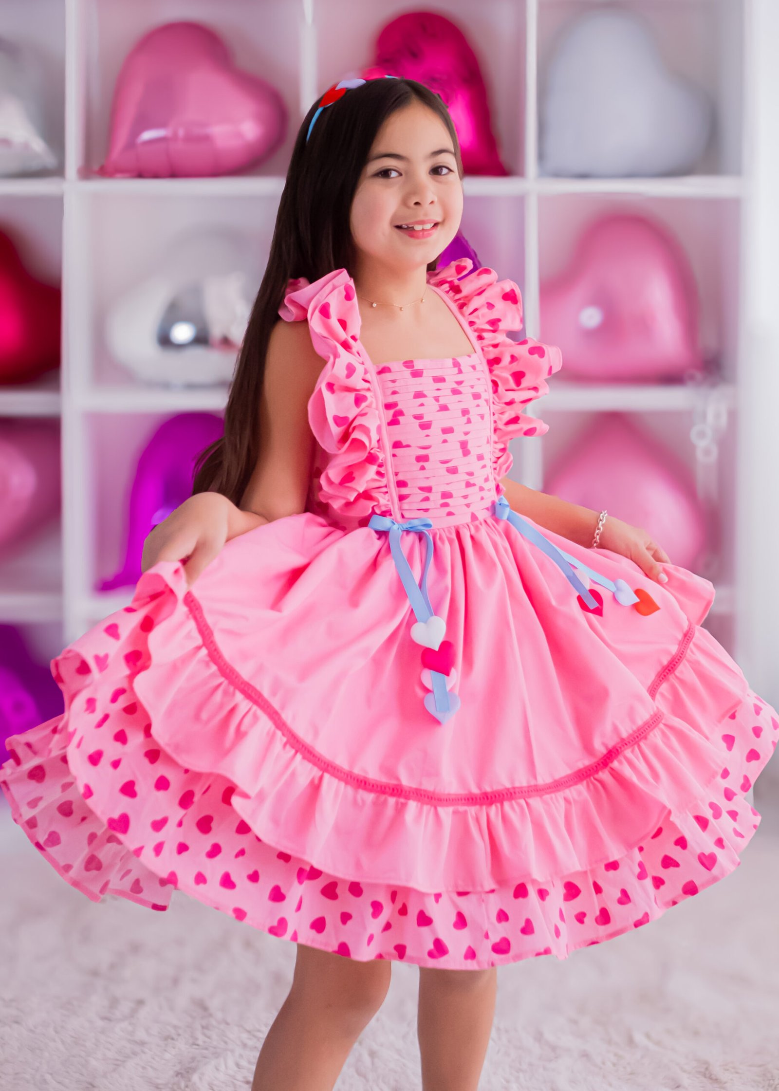 Color is a vibrant pink base with red heart patterns, giving it charming look. A smocked at the back, a fitted waist with a light blue ribbon.