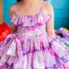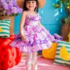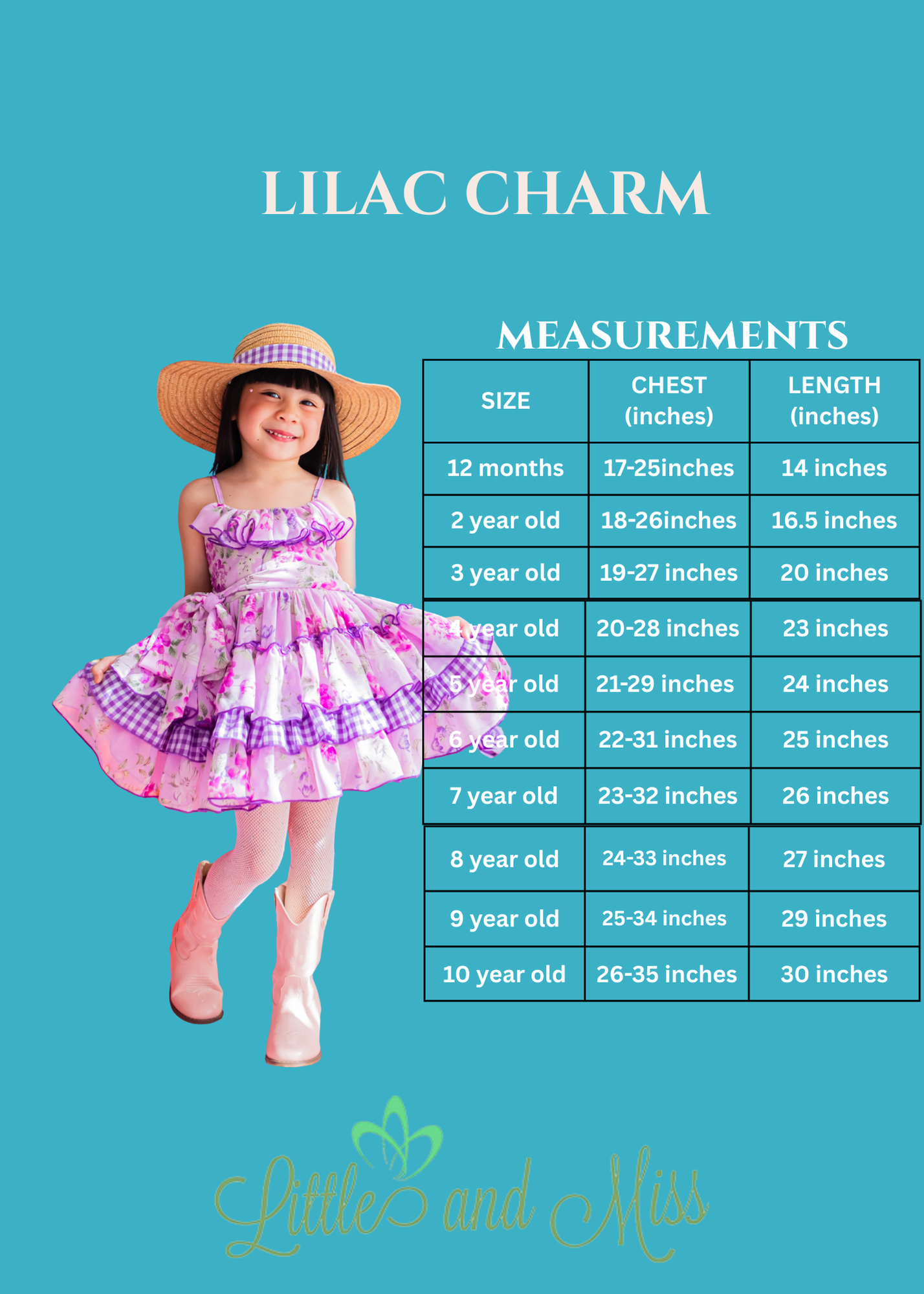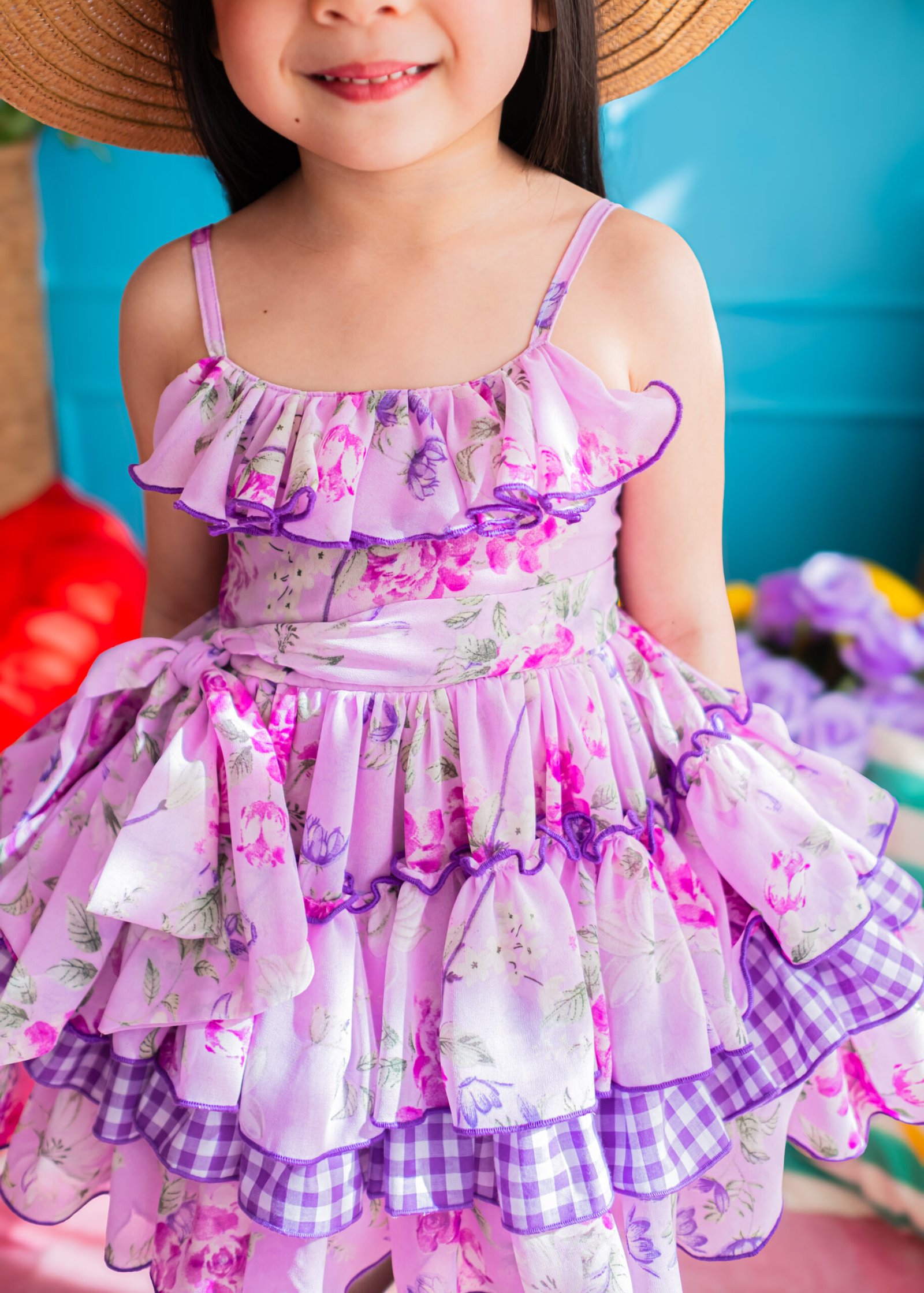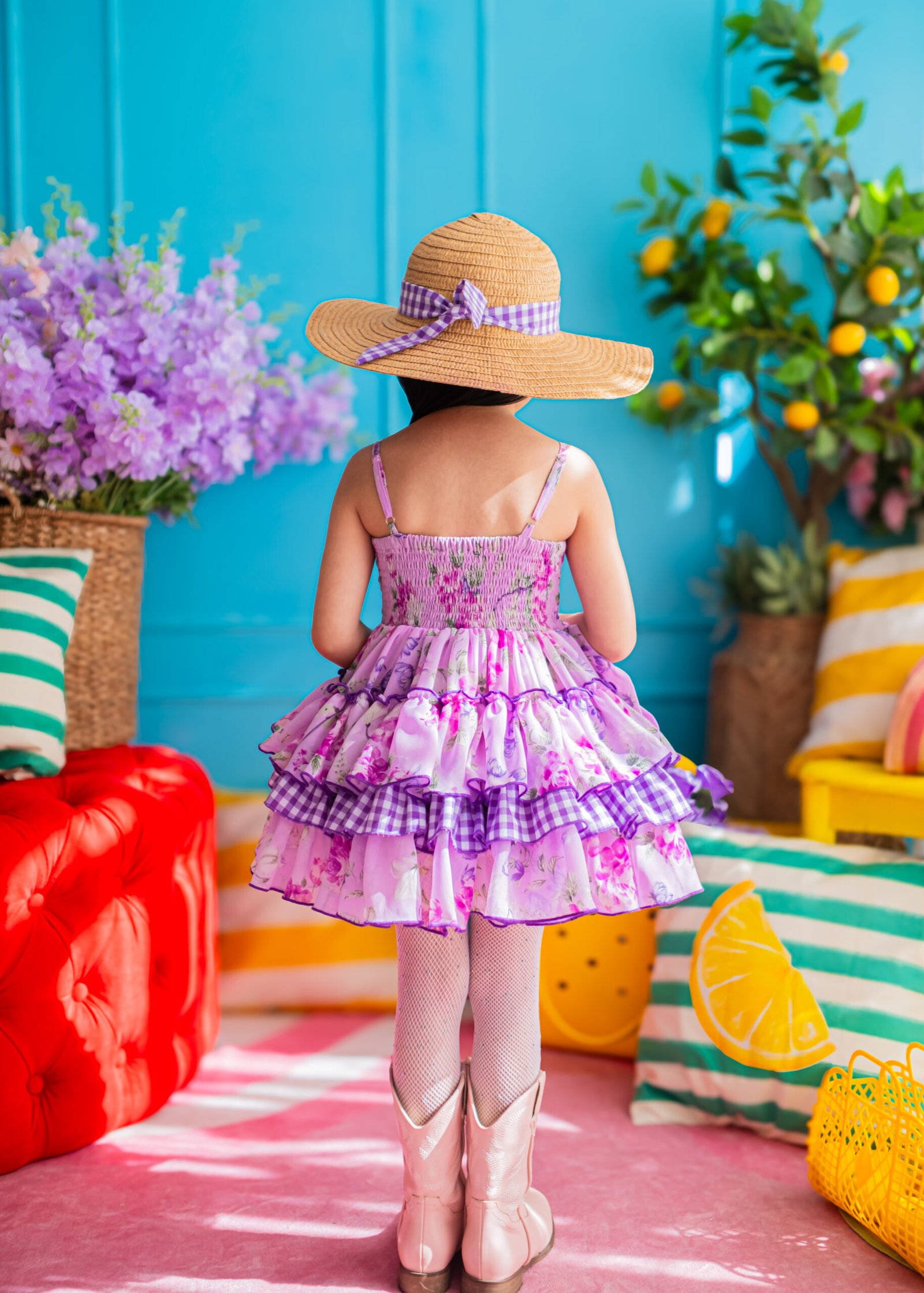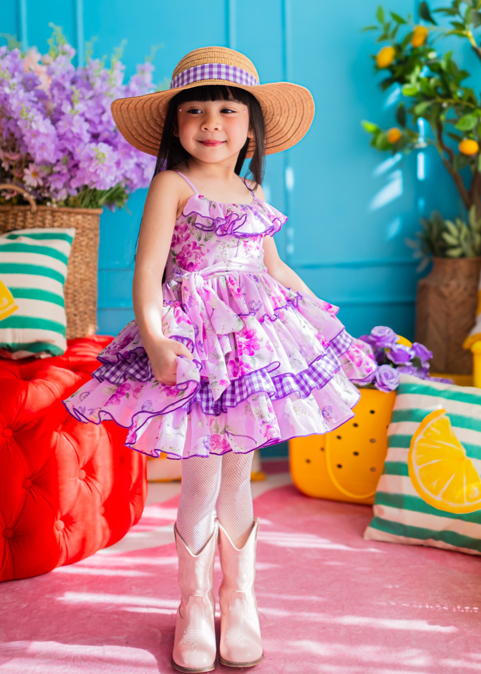 • A twirl-worthy lavender floral dress with playful ruffles and gingham trim, made for sunny days and sweet little adventures. Light, breezy, and full of charm—perfect for minis who love to spin, smile, and steal the spotlight