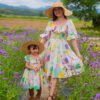 This charming patchwork dress features a playful mix of pastel colors and floral prints, giving it a vintage-inspired, handcrafted feel. This dress has a ruffled, elastic neckline that can be worn on or off the shoulders, with flutter sleeves for an extra sweet touch. Its full, twirl-worthy skirt adds a whimsical flair, perfect for a sunny day outdoors.
