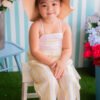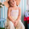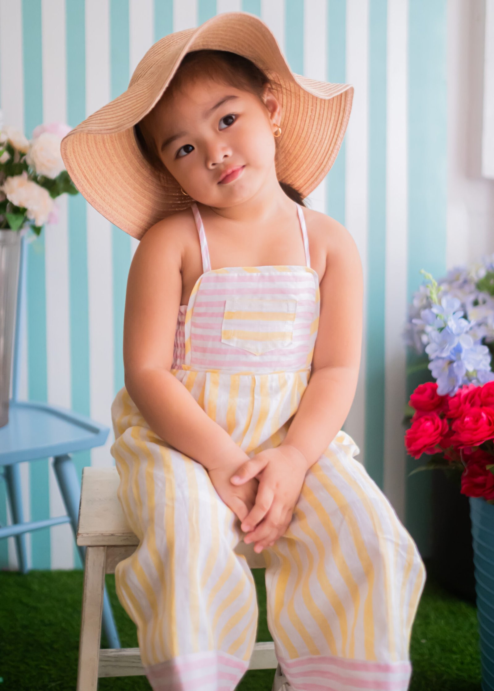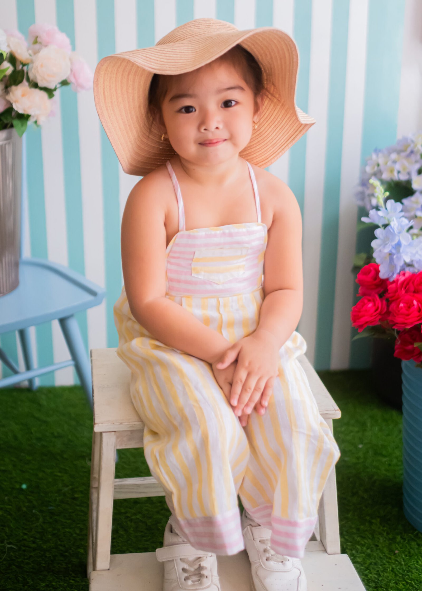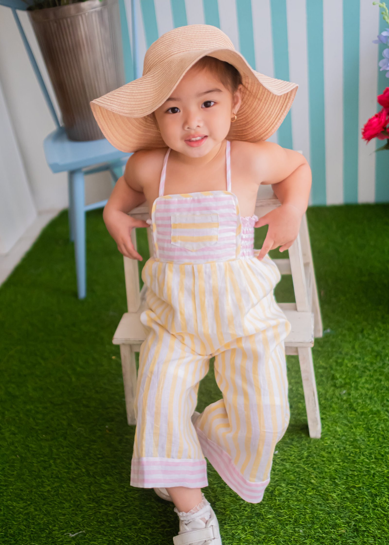 This linen romper is light, breathable, and fully lined with soft cotton for all-day comfort. It features a smocked back and adjustable tie straps for a flexible and easy fit. The playful mix of yellow and pink stripes adds a fresh and cheerful touch to its charming design. Perfect for sunny days, it’s a breezy outfit made for little adventures.