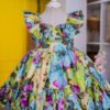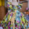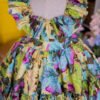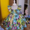 This charming kids’ dress features a vintage-inspired design with ruffled sleeves, a fitted bodice, and a twirly, full skirt trimmed with a playful ruffle. The fabric is decorated with bold, colorful prints of caladium-like tropical leaves in shades of teal, magenta, lime green, and brown on a soft beige background. The bright, leafy pattern adds a fun and cheerful touch, perfect for sunny days and special outings. It’s a delightful blend of whimsy and elegance for little ones.