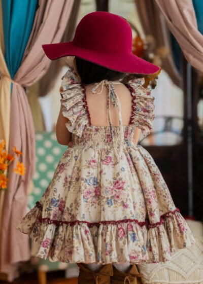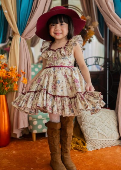 A charming classic that never goes out of style! It features a ruffled neckline, a full skirt with layered frills, with rich mahogany detailing and a dreamy vintage floral print. Perfect for portraits, parties, and playdates—just add boots and a hat for the ultimate cottage core look!