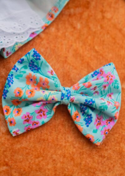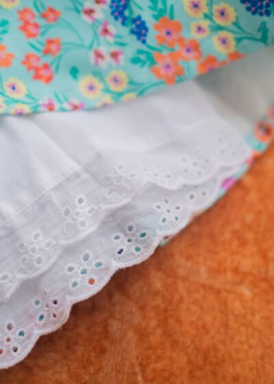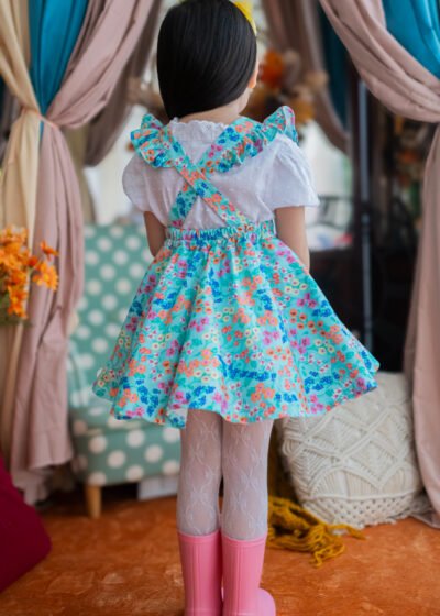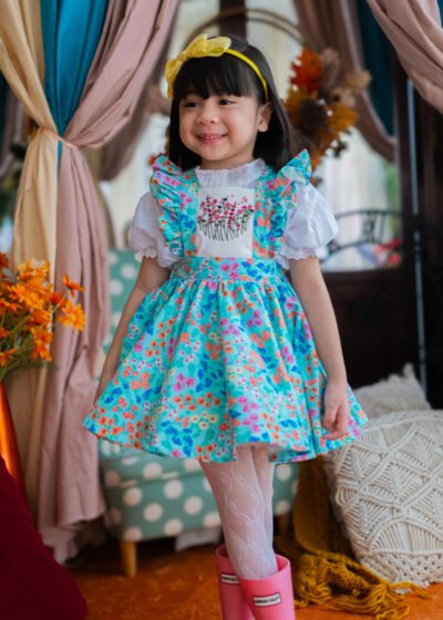 A turquoise floral pinafore frock with ruffled straps, an embroidered garden yoke, and a playful tiered skirt—made for nonstop twirls!