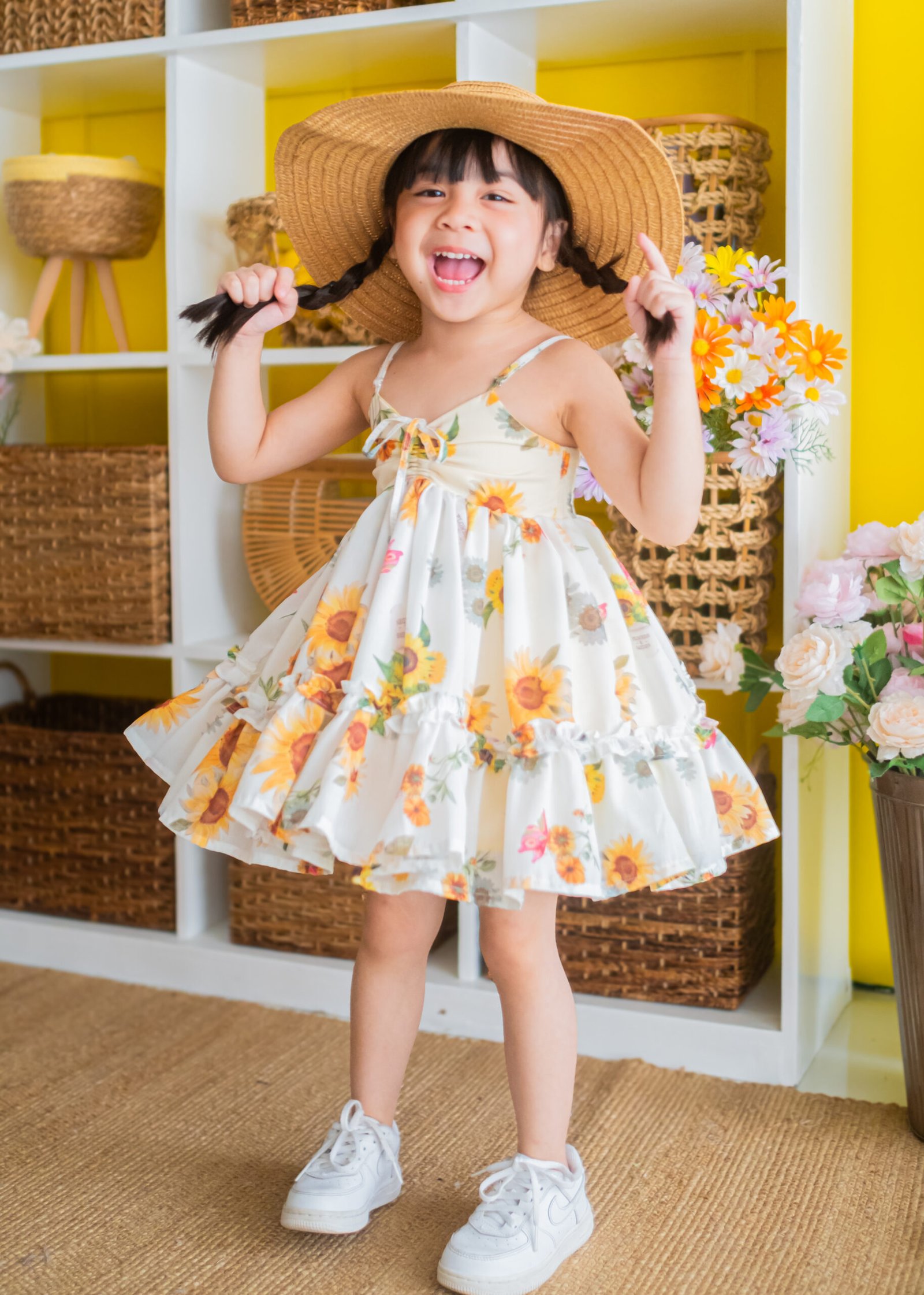 This is a charming, lightweight girl’s dress featuring a playful sunflower and floral print on a soft, flowy fabric. It has a ruched front with adjustable spaghetti straps for a customizable fit. The tiered ruffle hem adds extra volume and twirl-worthy flair, making it perfect for sunny days and special occasions.
