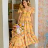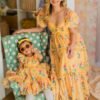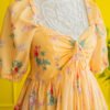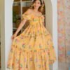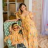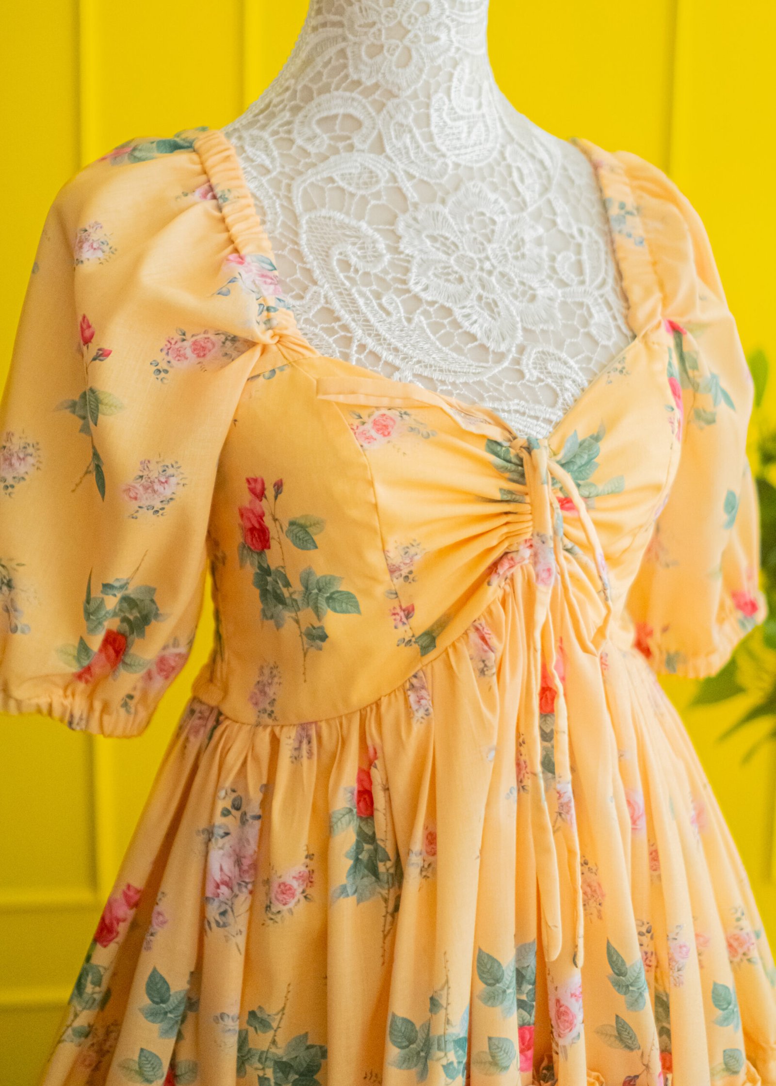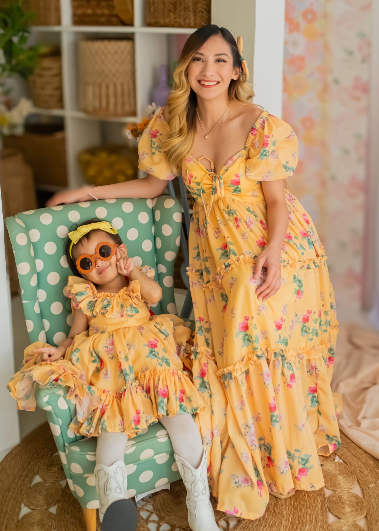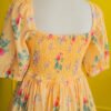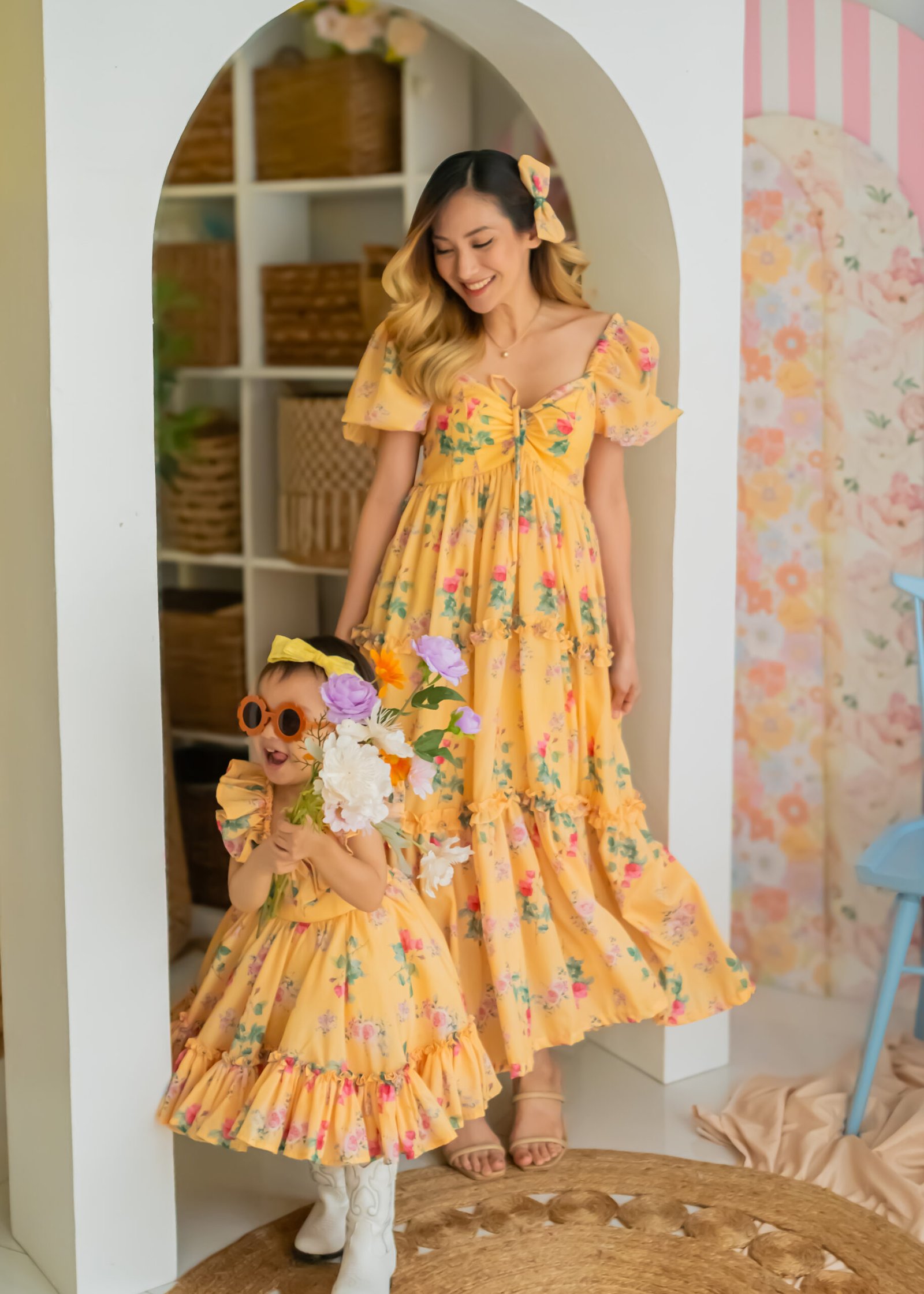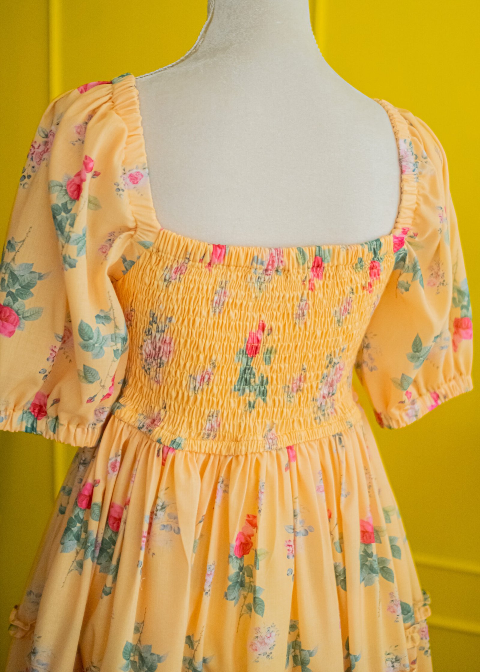 This sweet floral dress in a sunny yellow features playful puff sleeves and tiered ruffles for extra twirl. The vibrant blooms pop against the warm background, creating a cheerful, vintage-inspired look. Designed for comfort and movement, it’s perfect for any day that calls for a little extra sunshine. Its smocked in the back and fully lined with cotton