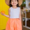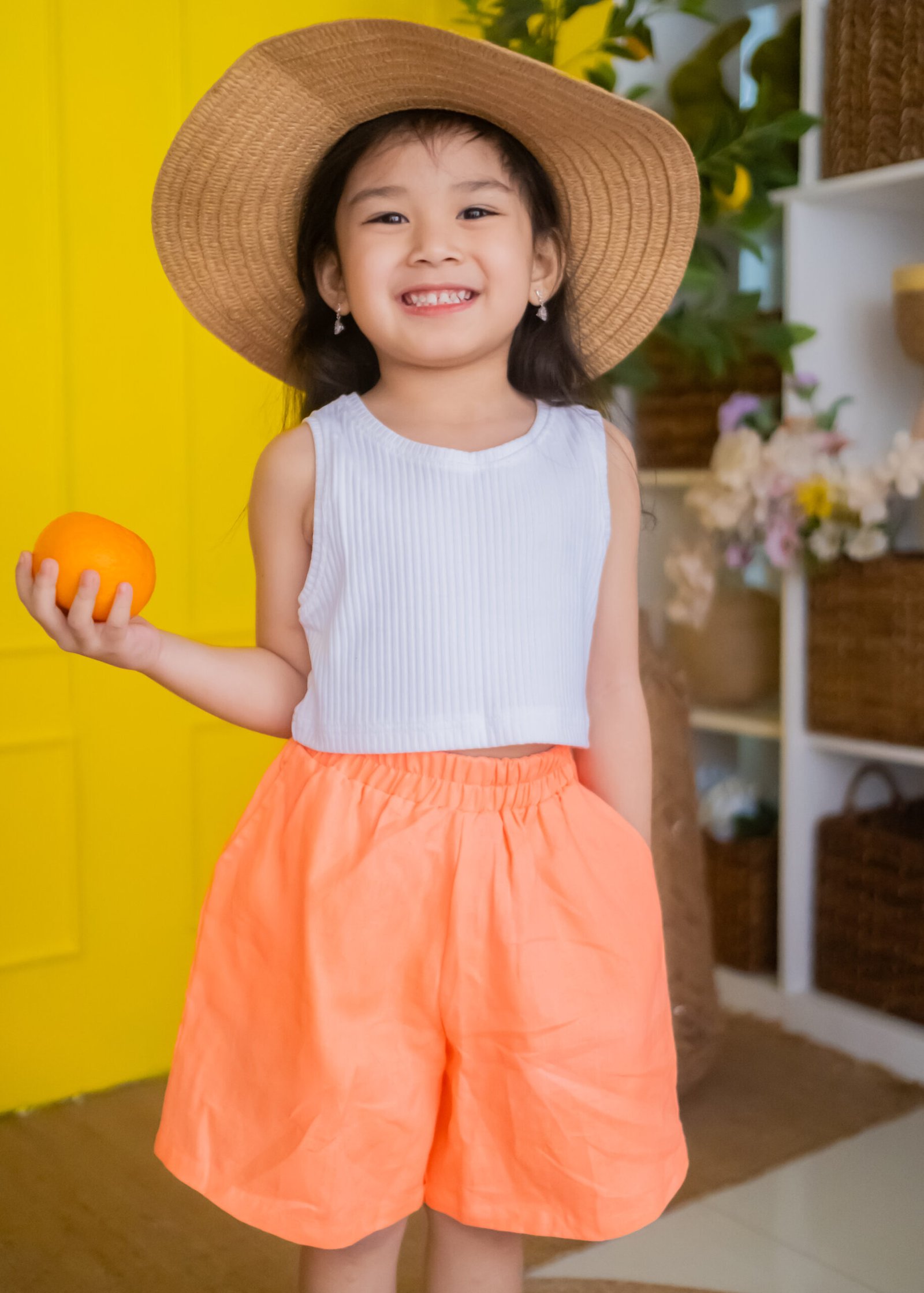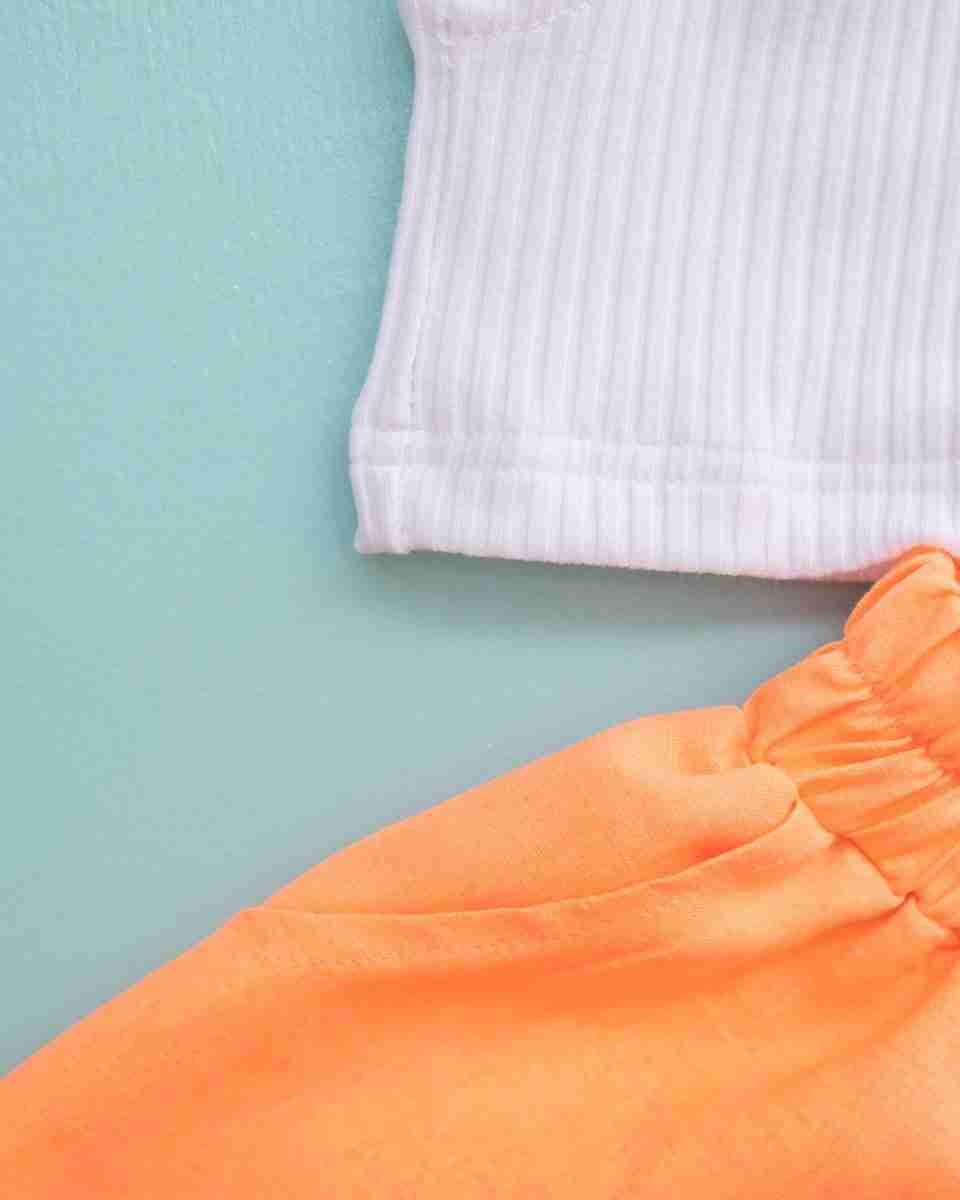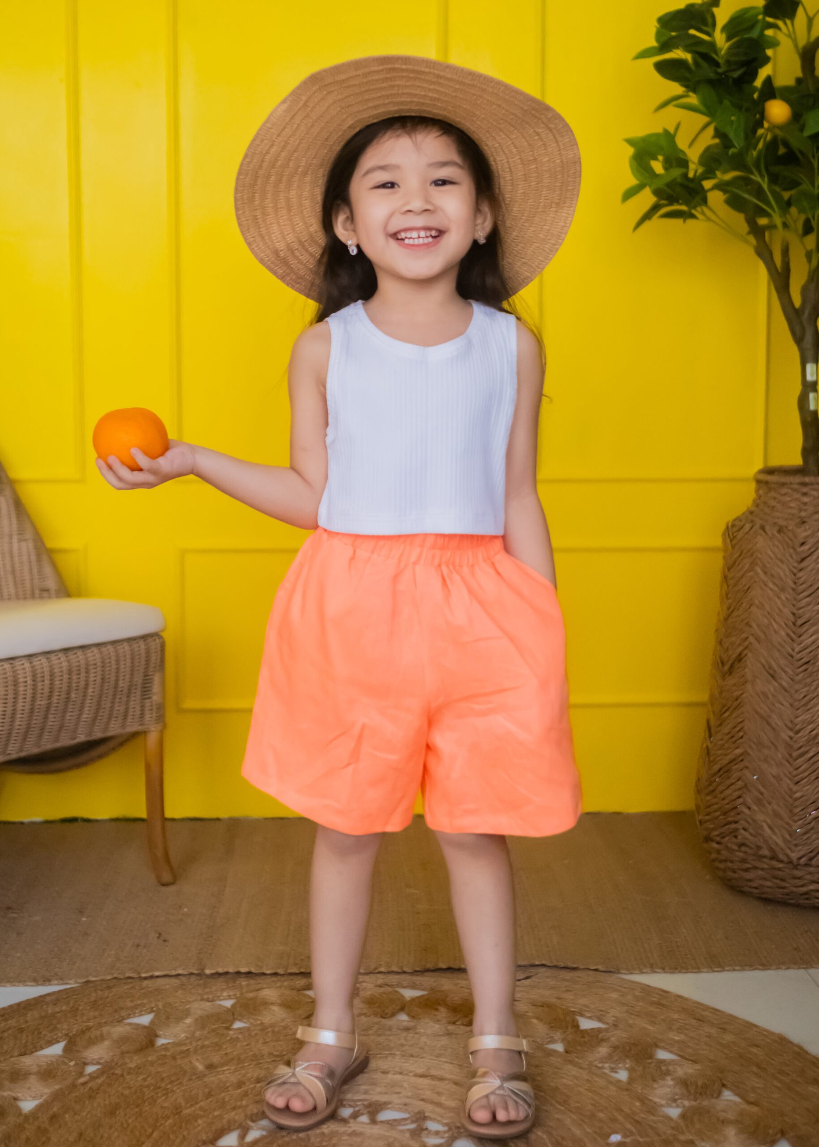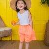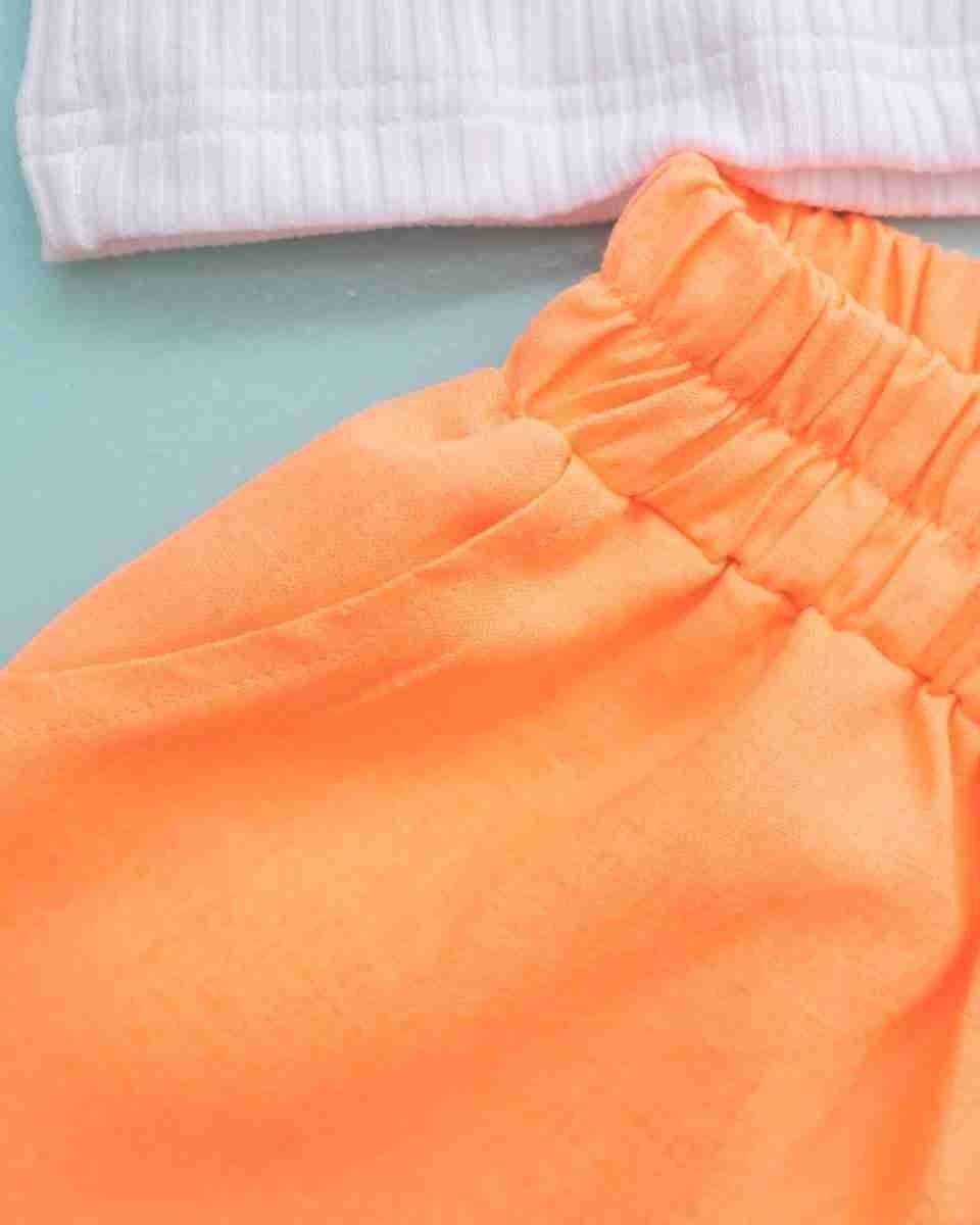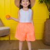 High-waisted, bright orange linen shorts with a loose fit and an elastic waistband for a relaxed and airy feel.