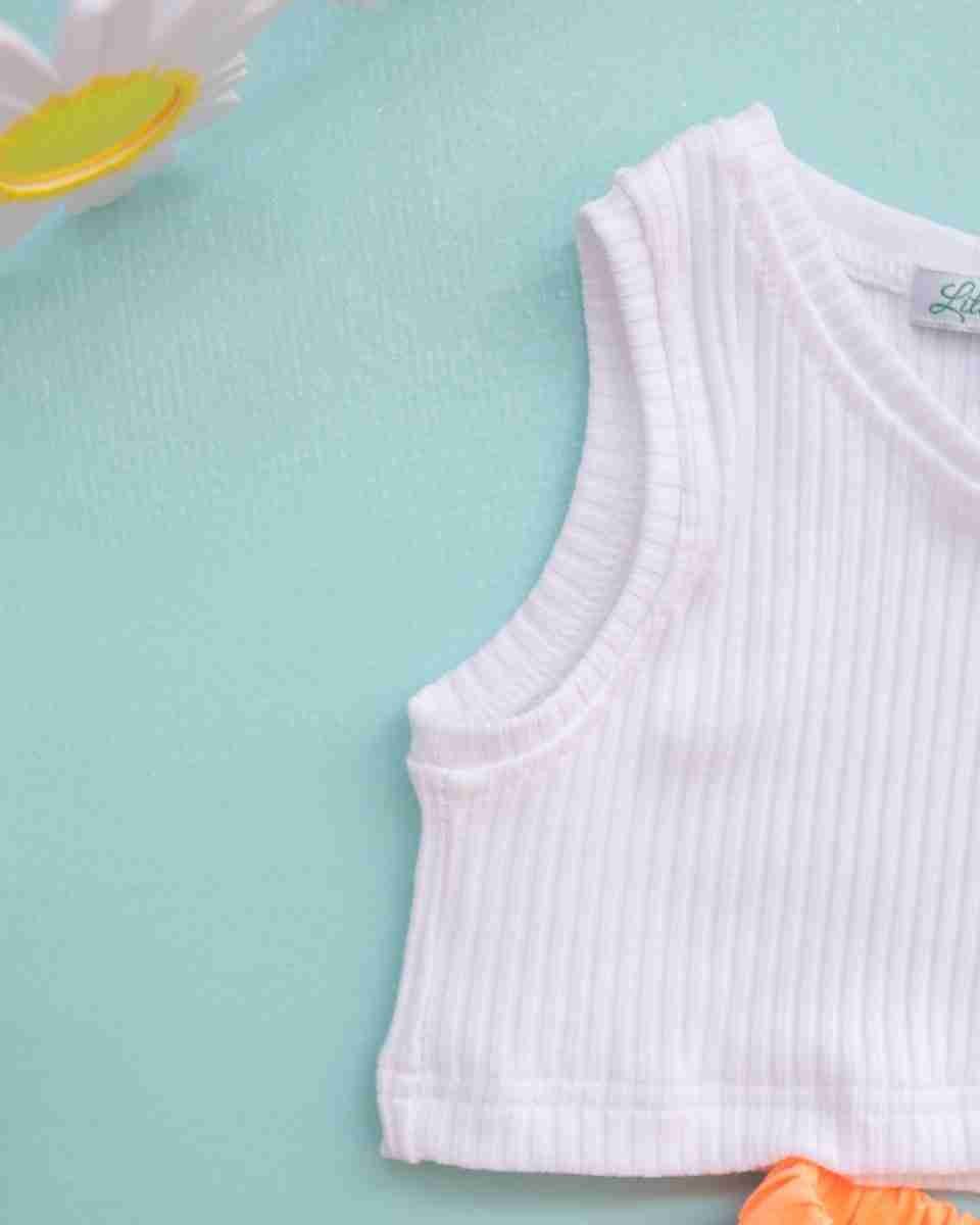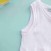 A sleeveless, white, 4-way stretch crop top with a subtle textured design, offering flexibility and comfort.