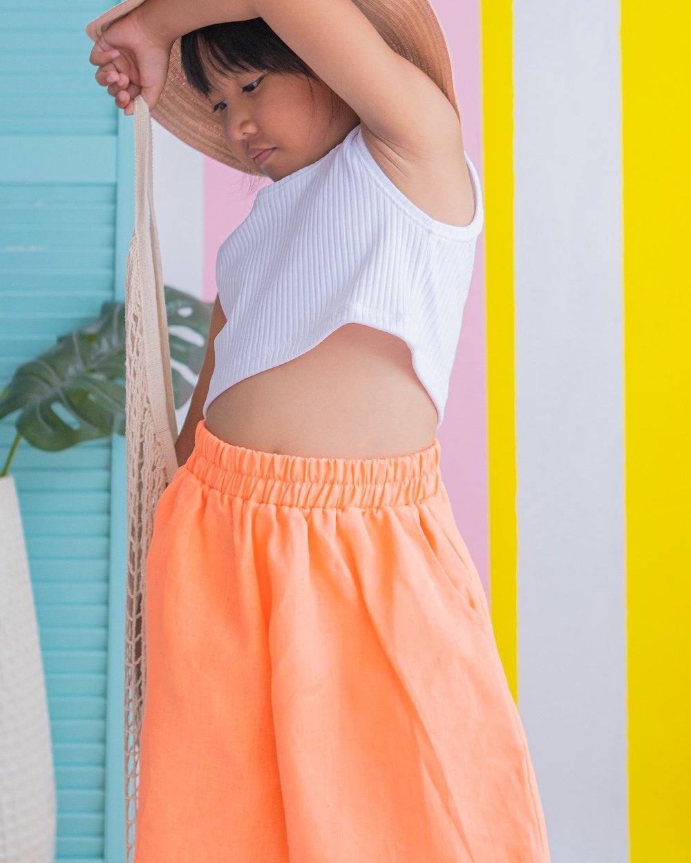 The combination of the stretchy top and breathable linen shorts creates a balanced mix of comfort and style, ideal for outdoor activities or a sunny day out.
